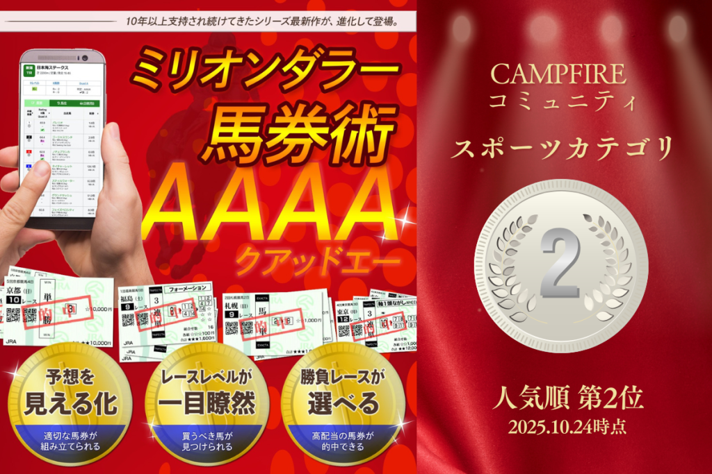 ミリオンダラー馬券術を開発して、ブログ、メルマガ、フリーソフトの各競馬メディアに次々と活躍の場を拡げ、JRAオッズマスターグランプリにも3度入賞。29歳では競馬書籍も刊行する。ラジオ出演や競馬バラエティ番組の制作、youtubuチャンネルの運営などもしており、2019年に4冊目のミリオンダラーAAAAを刊行。また競馬アプリうましりの監修なども含めて様々なアプローチで競馬ファンの人に役立つ武器を考案しています。